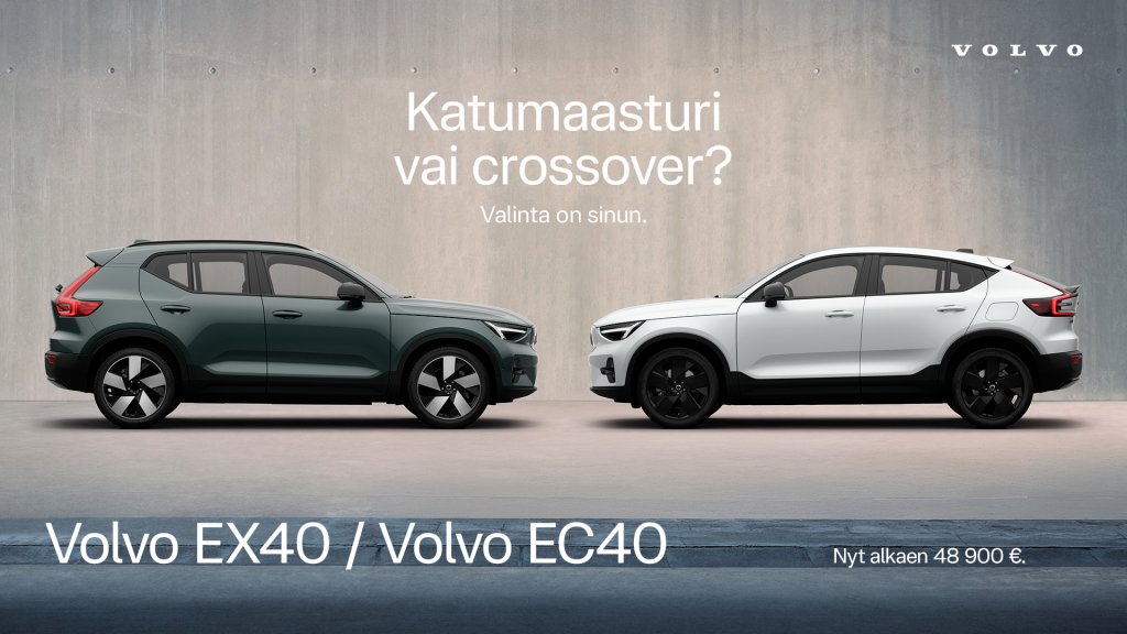 Volvo EX40/EC40 -mallisto alkaen: autoveroton hinta 48 300 €, autovero 0 €, toimituskulut 600 €, yhteensä 48 900 €. Käyttöetu alk 605 €/kk, vapaa autoetu alk. 665 €/kk. Ajoakun käyttökapasiteetti 66-79 kWh, toimintamatka 466-581 km, keskikulutus 16,3-18,1 kWh/100 km, CO2 0 g/km (WLTP). Volvo EX40/EC40 Plus Black Edition -mallisto alkaen: autoveroton hinta 53 100 €, autovero 0 €, toimituskulut 600 €, kokonaishinta 53 700 €. Käyttöetu alk. 675 €/kk, vapaa autoetu alk. 735 €/kk. Ajoakun käyttökapasiteetti 79 kWh, toimintamatka 522-573 km, keskikulutus 16,6-18,1 kWh/100 km, CO2 0 g/km (WLTP).