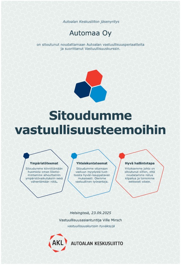 Vi förbinder oss till bilbranschens principer för ansvarsfullhet och har genomfört Bilbranschens Centralförbunds kurs i ansvarstagande.